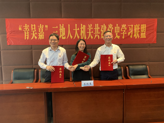 活动现场,“青吴嘉”三地人大机关举行了签约仪式,围绕“成立一个共建工作专班、开展一次主题党日活动、开展一次专题学习培训、组织一次党史学习竞赛、提炼一批共建活动成果”等“六个一”内容,共同签署了三地人大机关共建党史学习联盟倡议书。